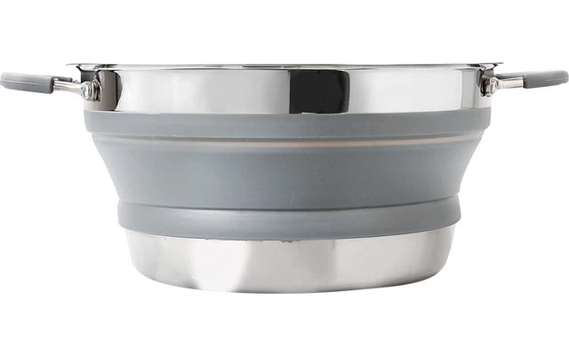 Das 4-teilige Kochset aus hochwertigem Edelstahl und Silikon besteht aus einem großen Topf, einer Pfanne mit abklappbarem Griff, einem praktischen Sieb und einem Deckel aus bruchsicheren Glas wie auch Anti-Rutsch-Kante. Die Griffe sind mit hitzebeständigem Silikon beschichtet. Und das Beste: Das Set ist dank flexibler Silikonwände extrem flach zusammenfaltbar (9 cm Höhe) sowie ineinander verstaubar – so nimmt es nur wenig Platz im Gepäck ein. Zudem ist es pflegeleicht, lebensmittelecht, BPA-frei und spülmaschinengeeignet.