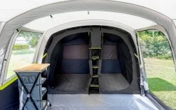 Der Eingang kann mit den Aufstellstangen in ein Vordach verwandelt werden und erweitert den Wohnraum. Das abgedunkelte Innenzelt ist mit dem Vario Vent Control System ausgestattet. Der Moskitonetzeingang hält lästige Plagegeister fern und kann bequem von innen, je nach Klima, variabel bedient werden.
