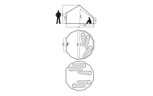 - Überzelt (L × B × H): 375 × 400 × 250 cm